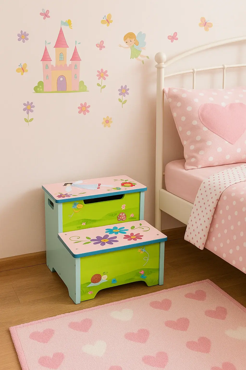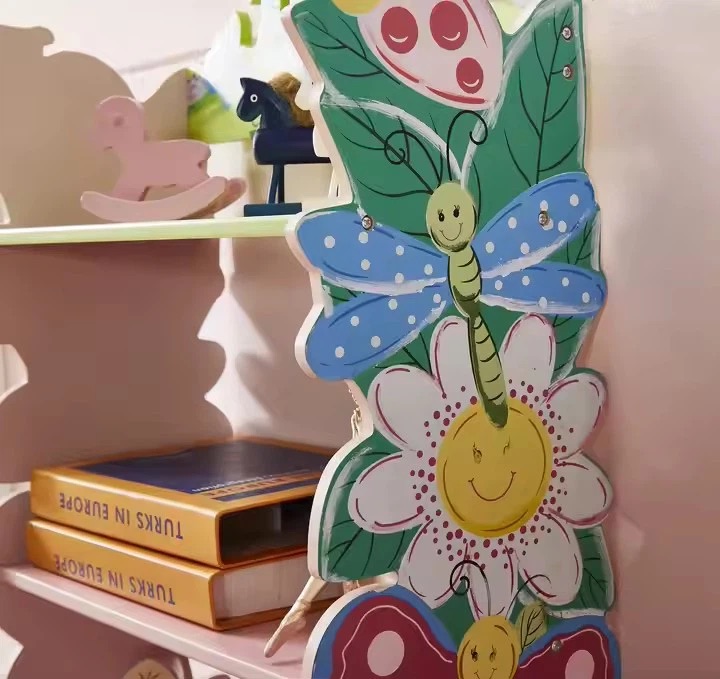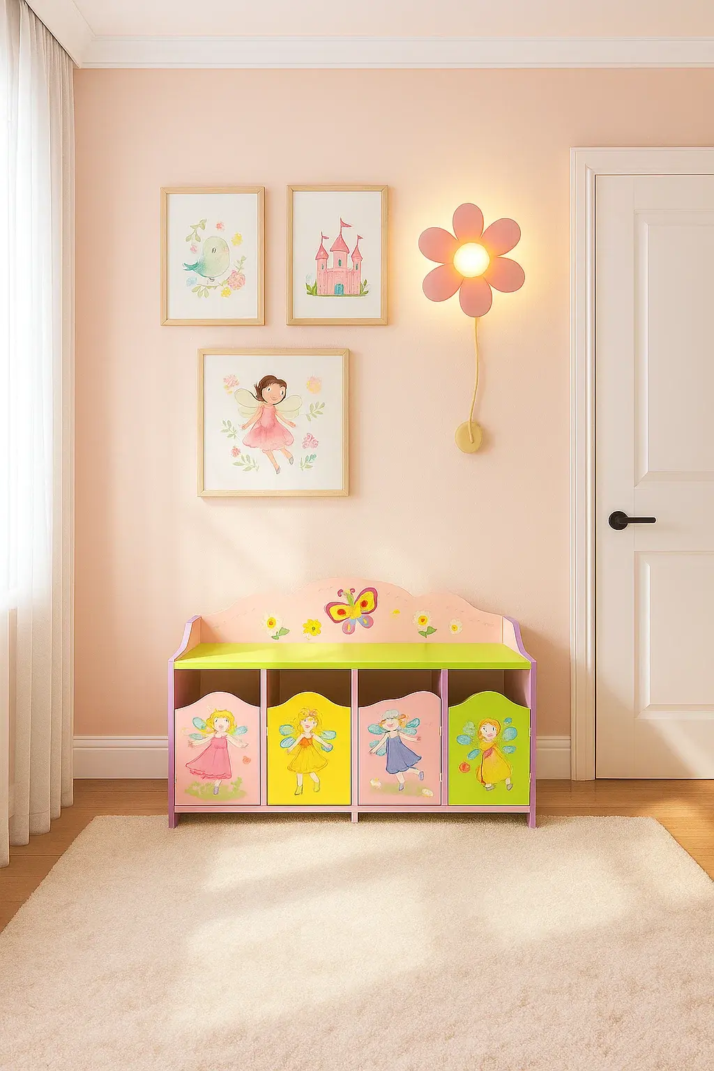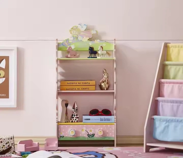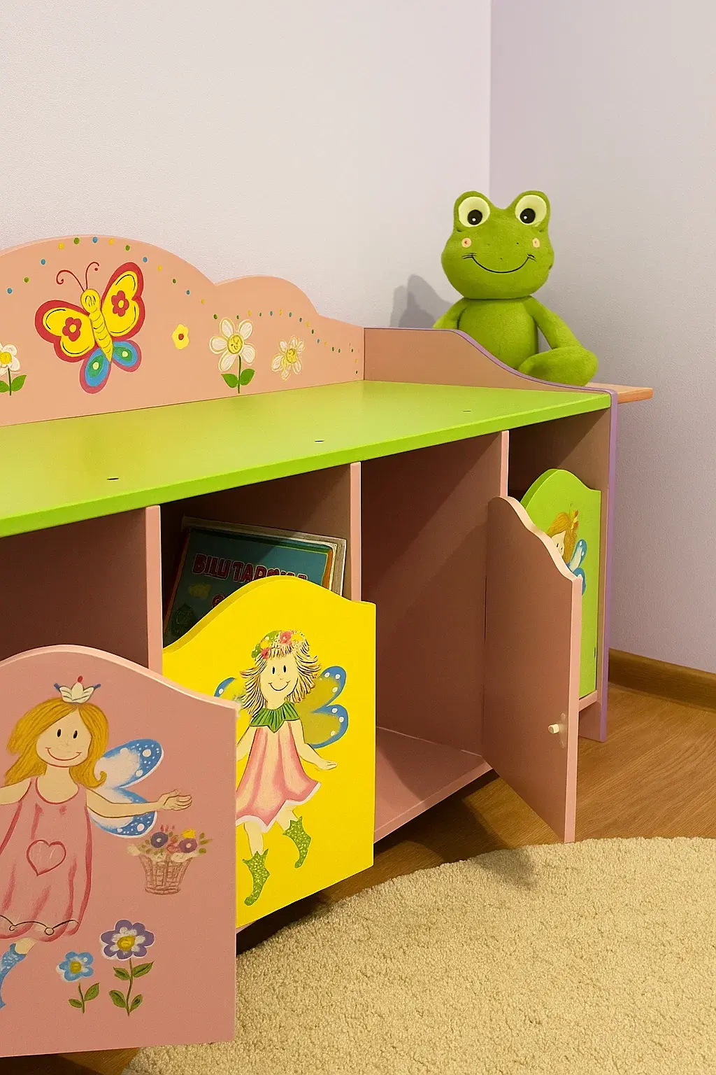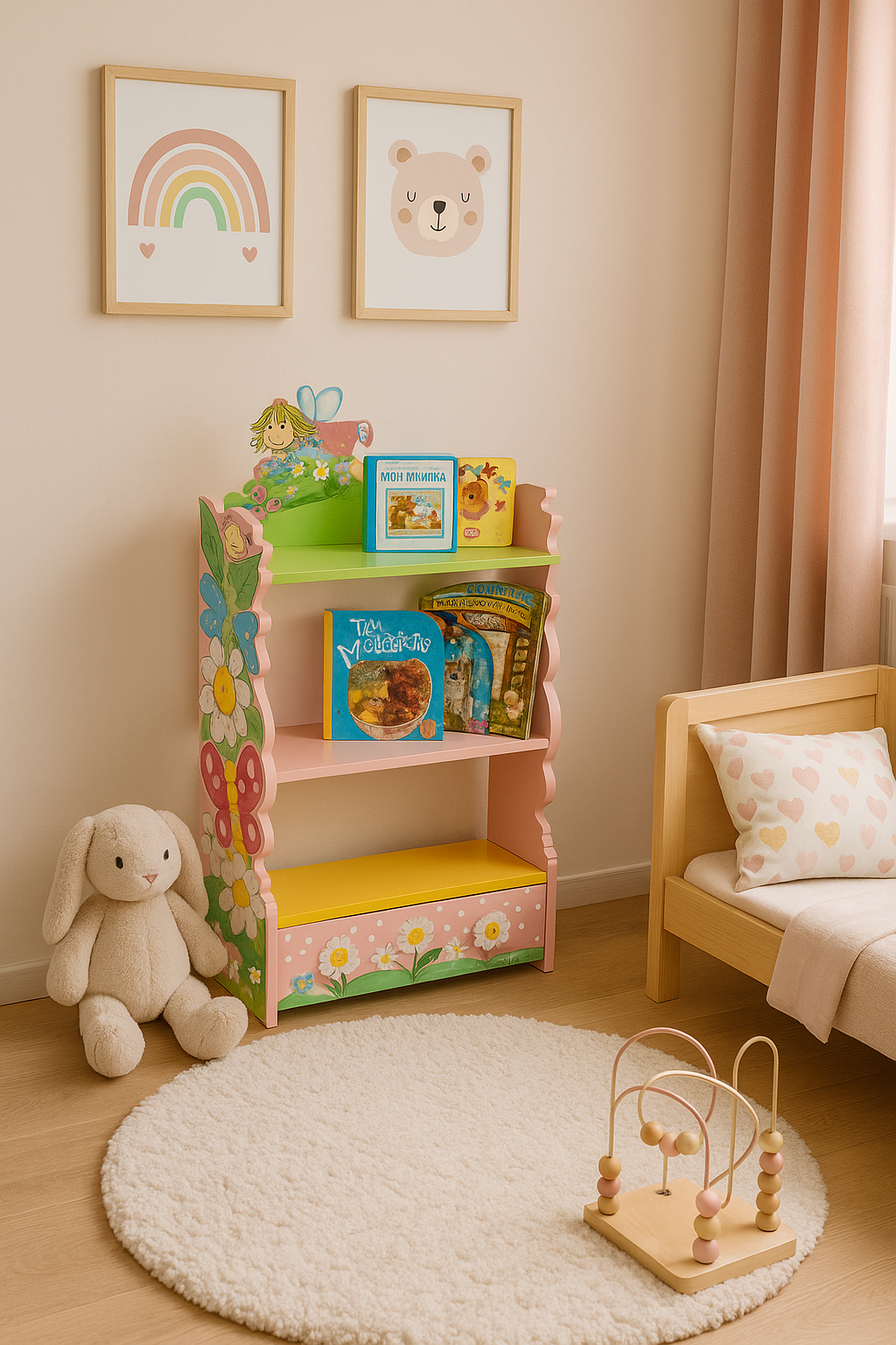 Яркая и удобная книжная полка специально создана для детской комнаты. Благодаря низкой высоте ребёнок может сам доставать и убирать книги или игрушки, что развивает аккуратность и самостоятельность. Полка украшена красочными рисунками феи, бабочек и цветов, которые создают сказочную атмосферу.