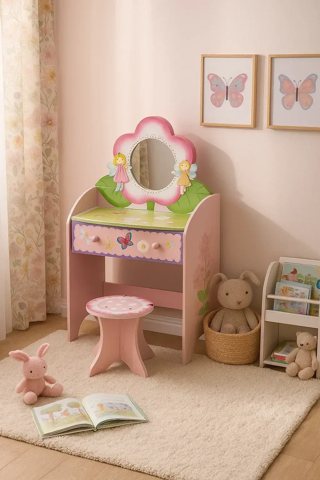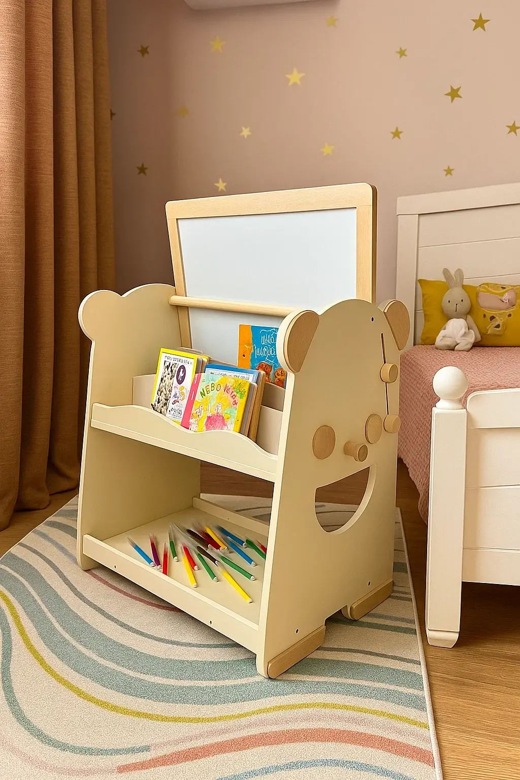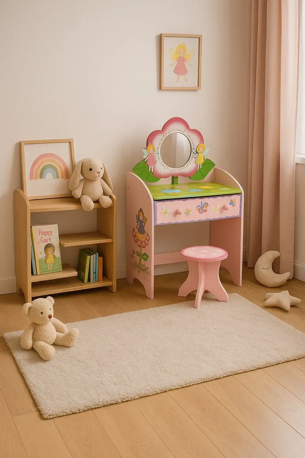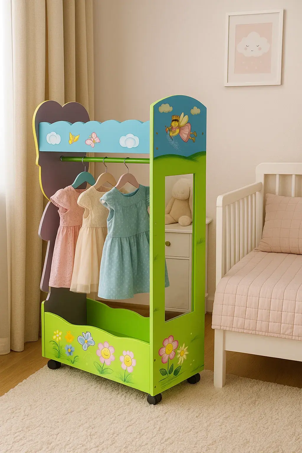 Яркая и удобная книжная полка специально создана для детской комнаты. Благодаря низкой высоте ребёнок может сам доставать и убирать книги или игрушки, что развивает аккуратность и самостоятельность. Полка украшена красочными рисунками феи, бабочек и цветов, которые создают сказочную атмосферу.