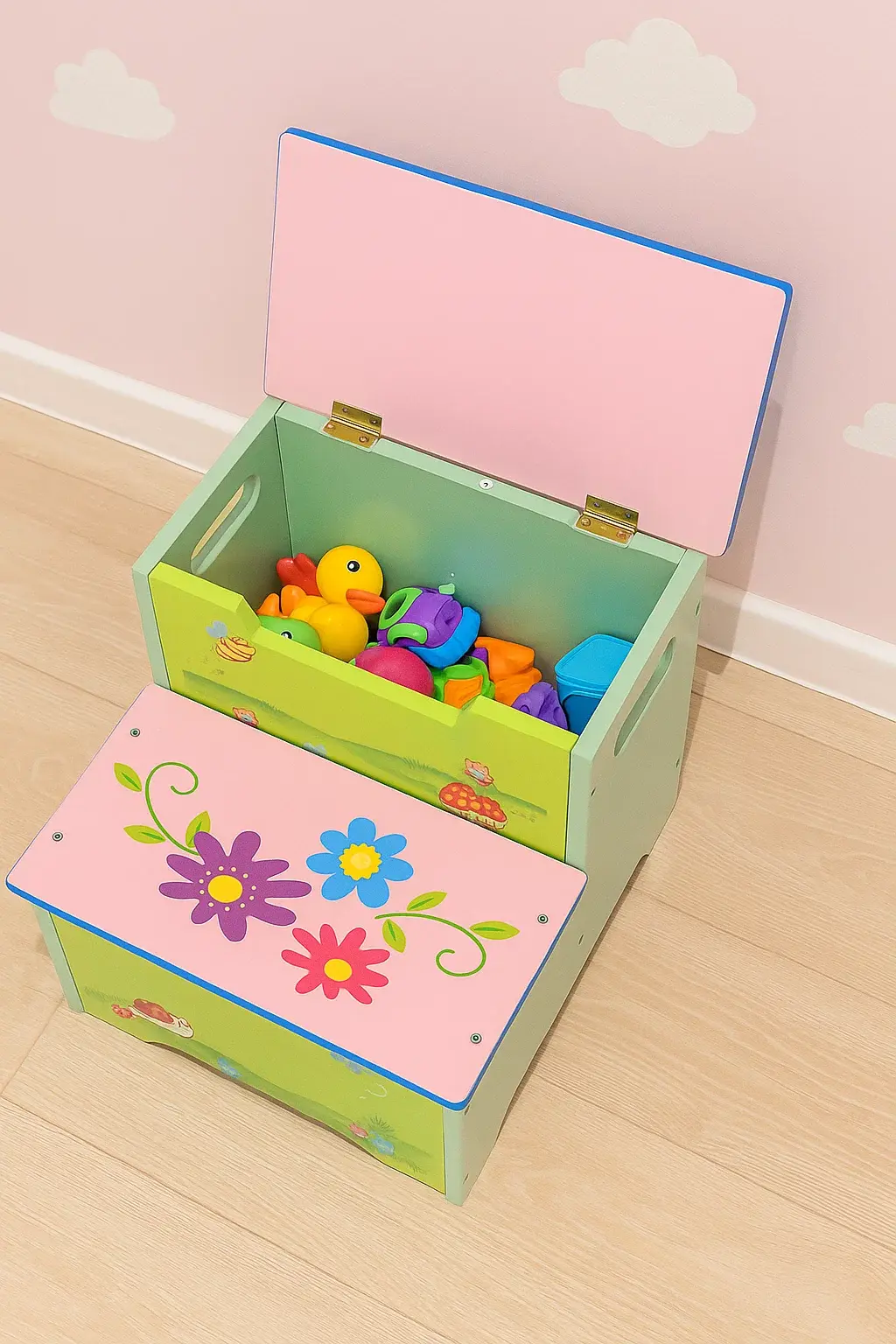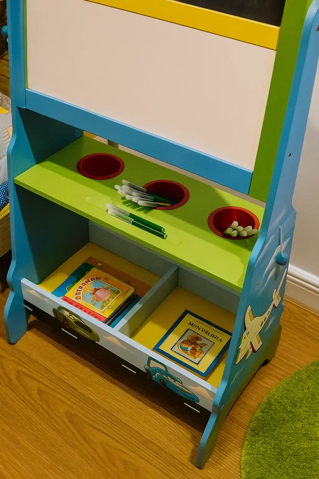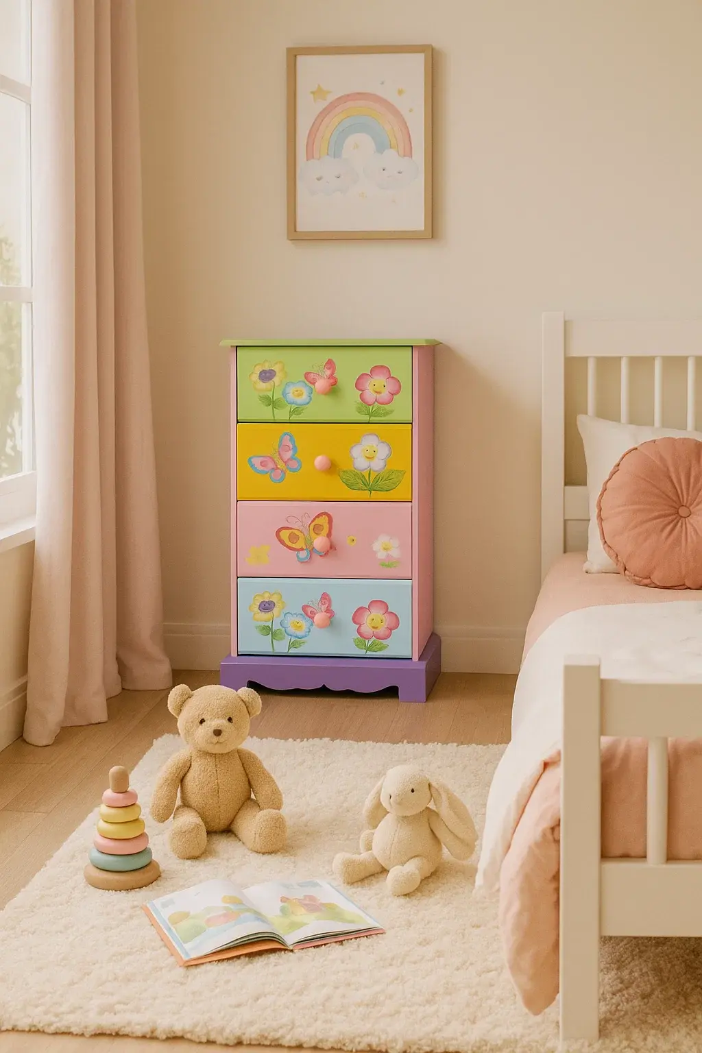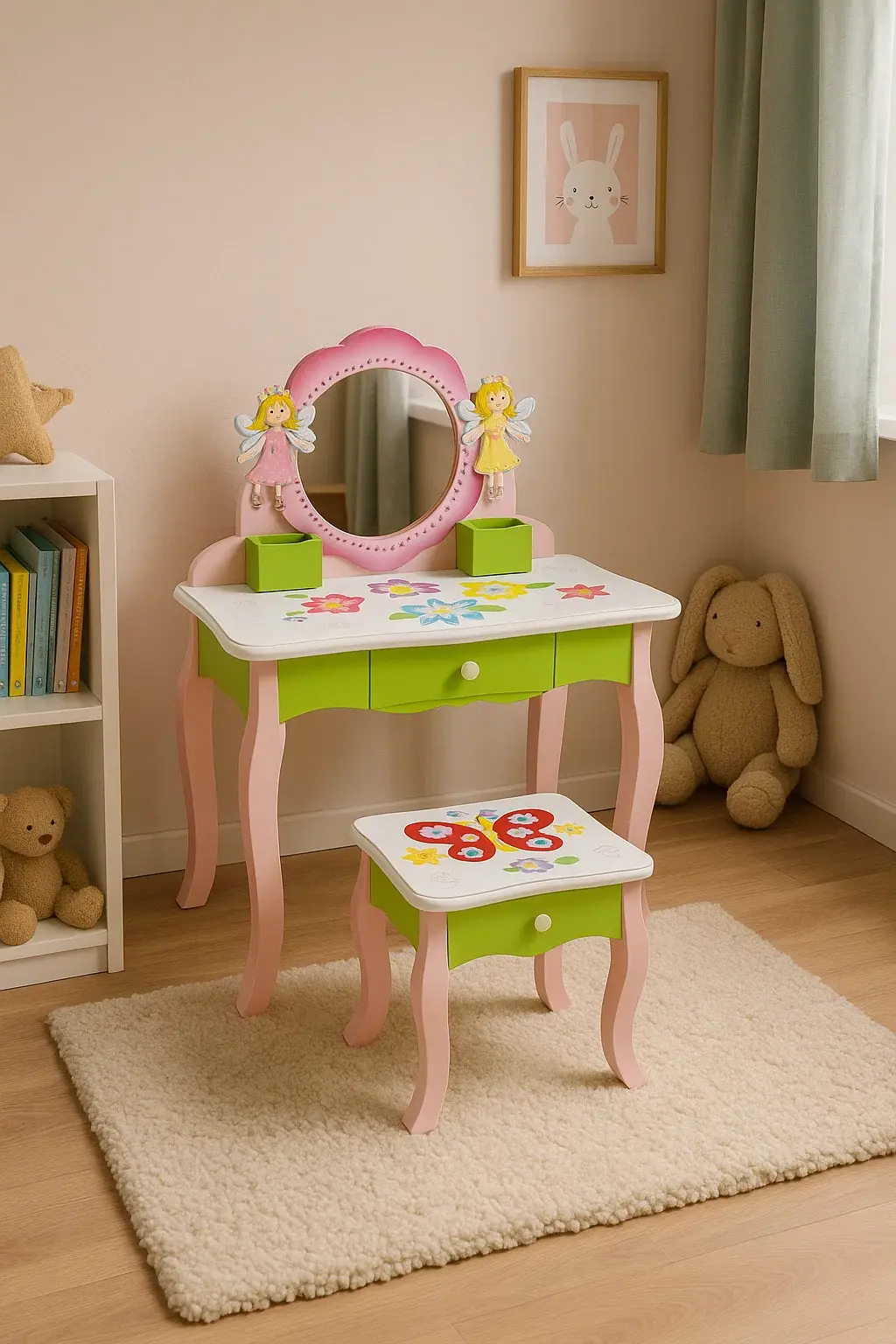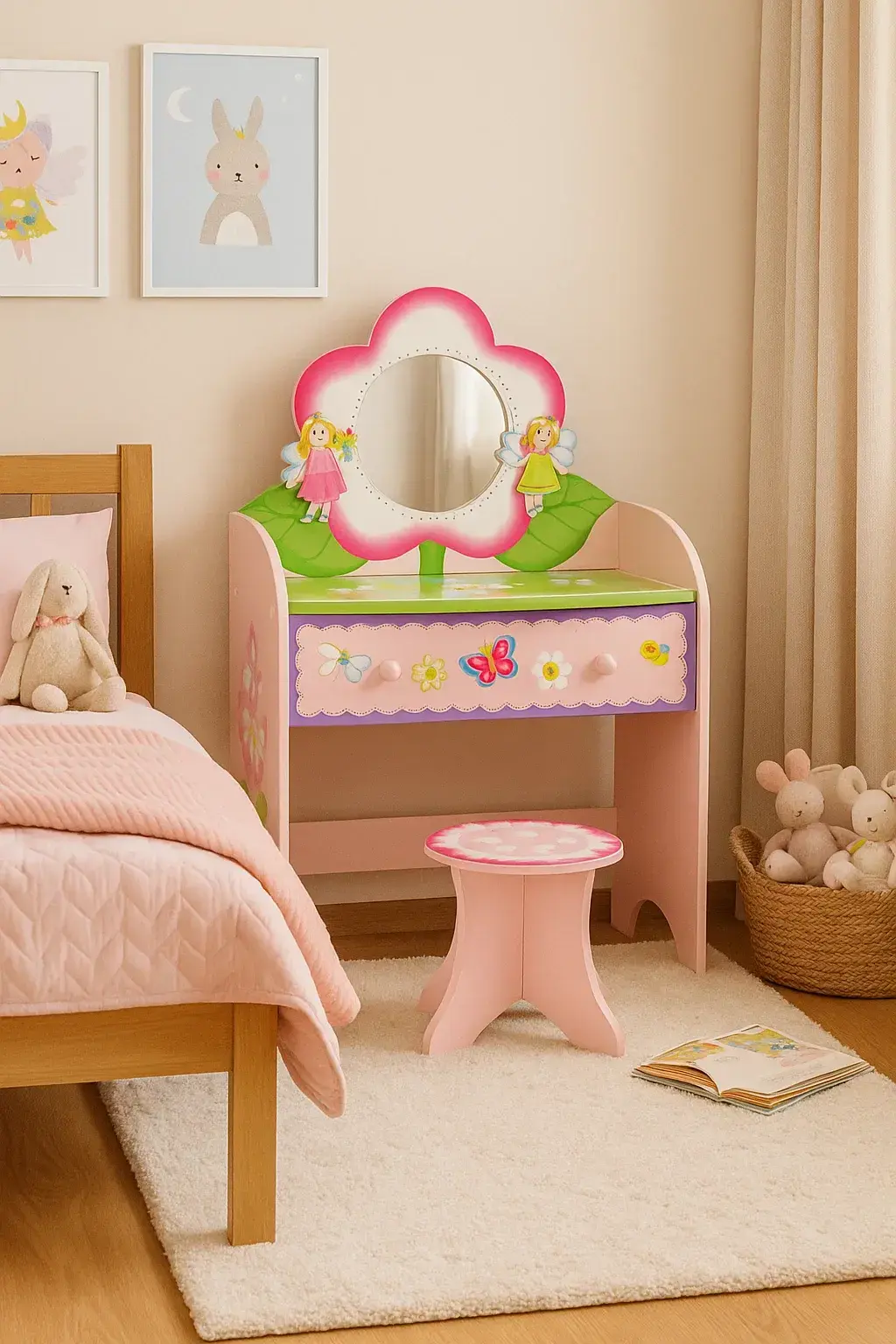 Яркая и удобная книжная полка специально создана для детской комнаты. Благодаря низкой высоте ребёнок может сам доставать и убирать книги или игрушки, что развивает аккуратность и самостоятельность. Полка украшена красочными рисунками феи, бабочек и цветов, которые создают сказочную атмосферу.